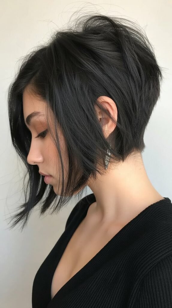 The angled bob features hair that’s longer in the front and gradually shorter toward the back, creating a slanted line that adds visual interest and lift at the crown.