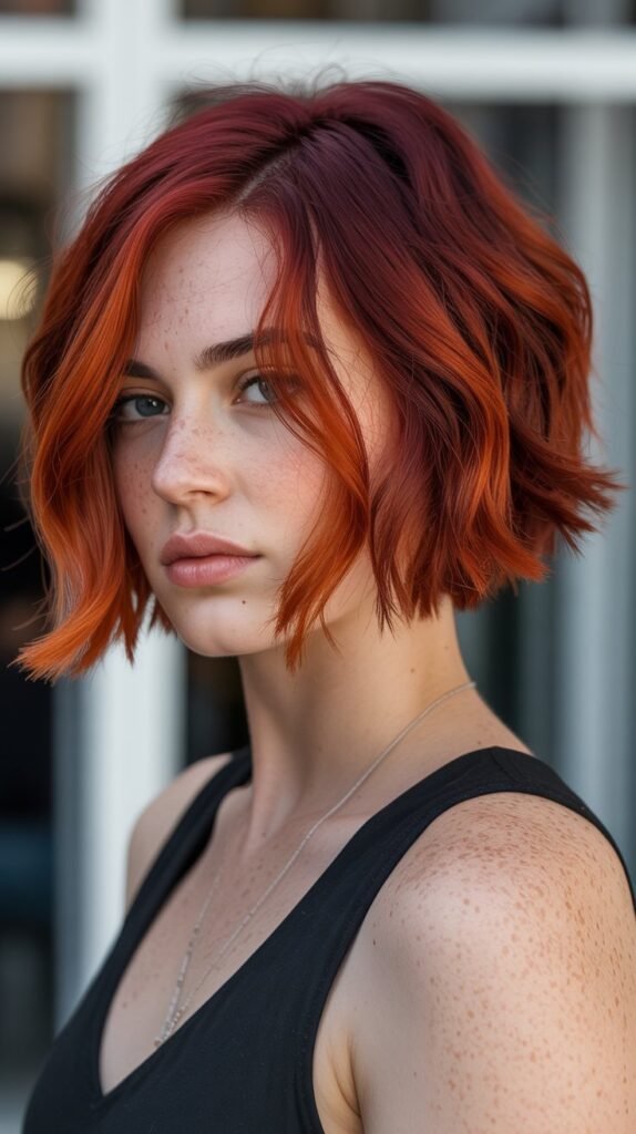 Red balayage brings vibrant energy and personality to the choppy bob, offering shades from copper to auburn. This eye-catching style demands attention while the choppy layers add softness.