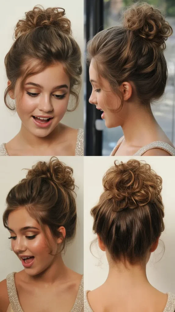 A curly bun is playful and elegant. It highlights natural curls beautifully. It keeps hair secure for dancing.