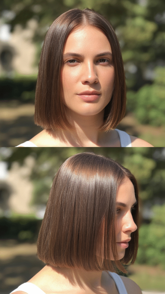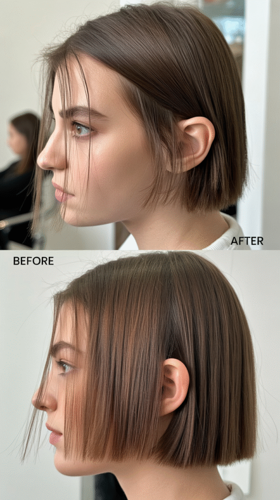- Silk or satin pillowcases reduce friction that creates frizz and disrupts the blunt cut’s smoothness.